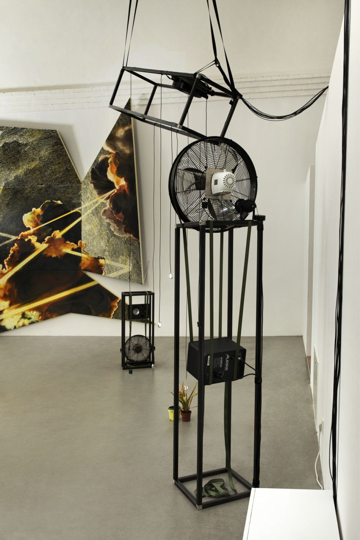 „Drone“, eine Installation von Udo Koloska, besteht aus Röhrenventilatoren und Lautsprechern. Sie bilden Rückkopplungen und klangliche Verformungen der Geräusche. Ausgangspunkt ist dabei eine Tonaufnahme im Potsdamer Garten des Künstlers vom 24.2.2022.