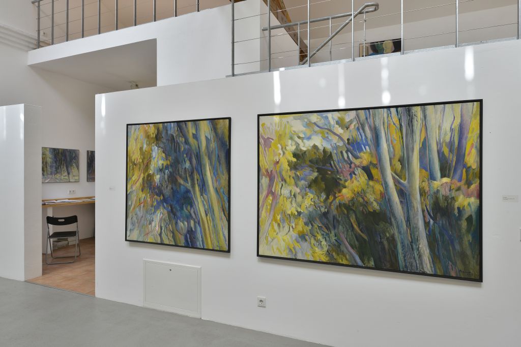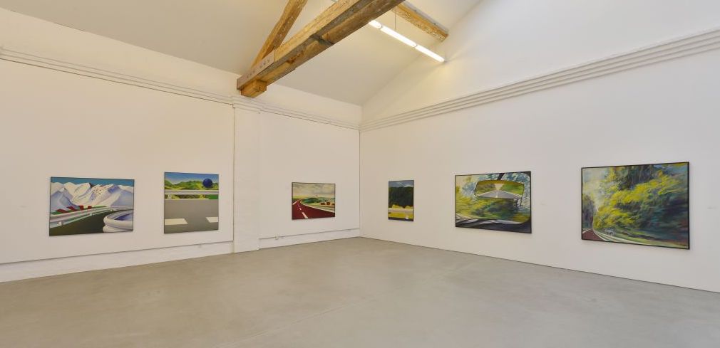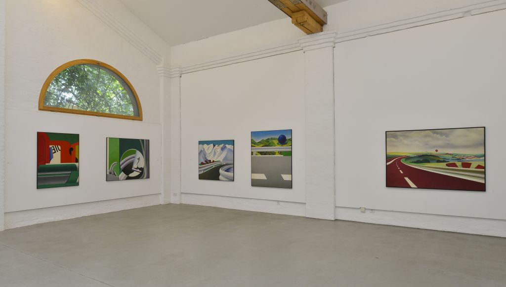 Peter Berndt er-fährt die von Menschen veränderte Natur aus dem Auto und hält seine Seiten-, Rück- und Vorausblicke in Malerei und Zeichnungen fest. Fenster und Rückspiegel verbinden Vergangenes, Gegenwärtiges und Zukünftiges. Die Dynamik scheinbar bewegter Brandenburger Alleen vermitteln weiche, flüchtige Farbtöne – „Impressionismus mit 80 Sachen“ (Eberhard Roters). Seine aktuellen Bilder zeigen den Künstler als Erforscher von Strukturen in Ausschnitten der Natur wie Geäst und Blattwerk. Die Landschaften der 1960er und 70er Jahre verbindet Peter Berndt mit ironisch gesetzten, kartographischen Zeichen. Als Ausrufezeichen weisen sie auf Panoramablicke hin oder markieren den Rhythmus der gefahrenen Kilometer. Die Ausstellung im Kunstverein KunstHaus Potsdam vereint aktuelle Landschaftsbilder mit frühen Werken Peter Berndts aus seiner Zeit in Rom (1965–67). Mit kräftigen Komplementärfarben zeigt er hier die Gleichzeitigkeit einer Fülle an Wahrnehmungen von Gegenständen oder Figuren am Straßenrand in collageartig kombinierten Ausschnitten.