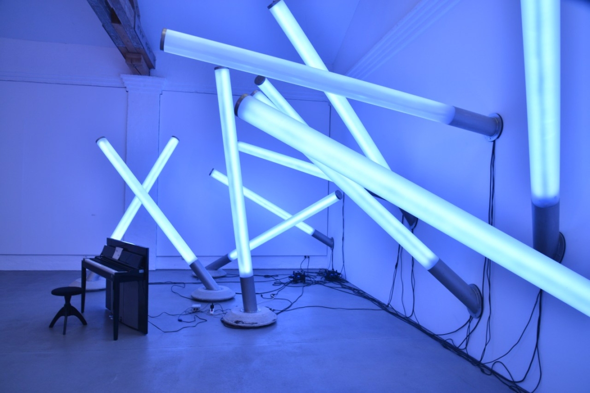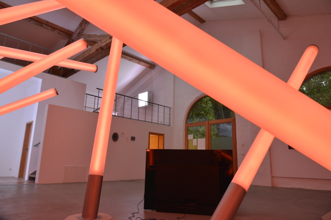 In der Ausstellung taucht der Besucher in ein Gesamtkunstwerk ein, bestehend aus Licht, Musik und Raum. Mit „Enlightenment machine“ schafft Betty Rieckmann ein Lichtinstrument, das sie in Anlehnung an das vollkommene Kunsterlebnis „Clavilux“ von Thomas Wilfred (1919) in eine eigene Formensprache übersetzt. Eine Vielzahl satinierter Rohre – jedes drei Meter lang – erstrahlt in unterschiedlichsten Farben. Über die Tasten eines Keyboards werden Töne lautlos in Lichtfarben übertragen. Dem Betrachter kommt eine interagierende Rolle zu. Im Spiel mit den Farben wird er selbst zum Komponisten und Choreographen.