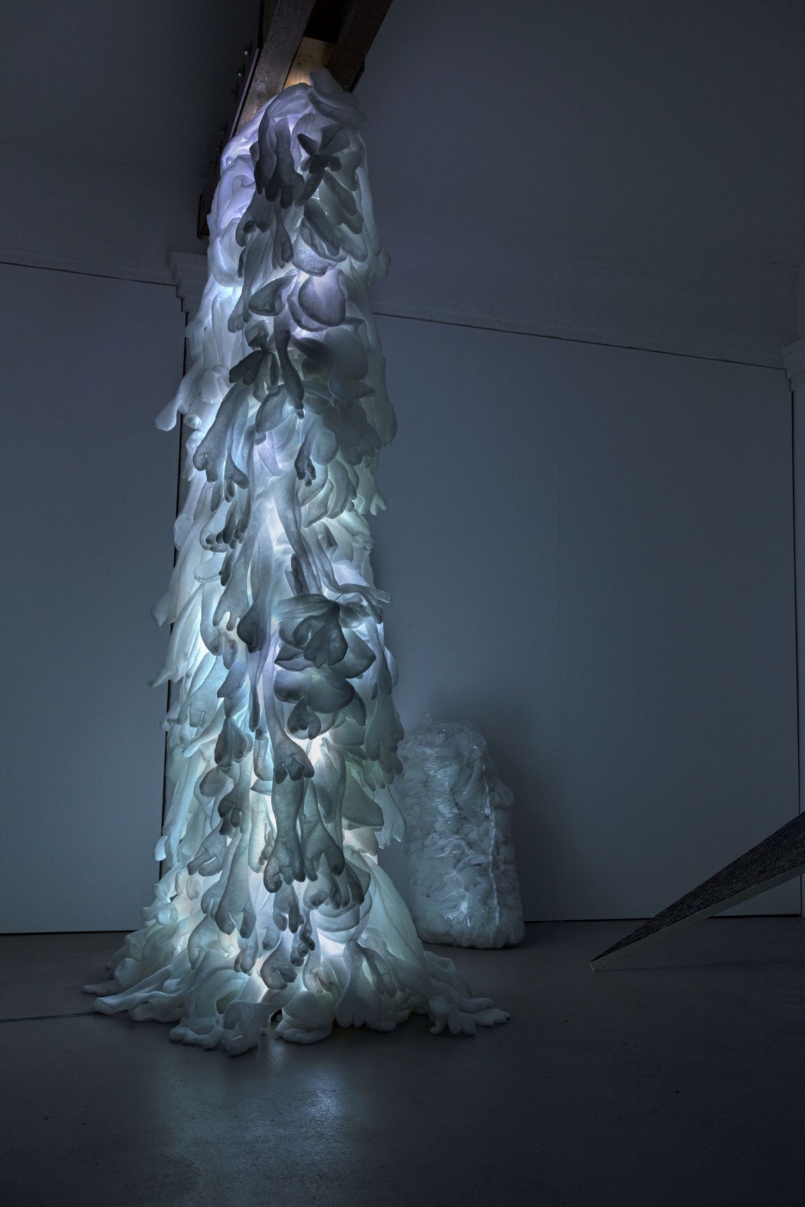 Die Installation von Jenny Alten zeigt weiche, halbtransparente Stoffkörper, die übereinander gestapelt im Ausstellungsraum sich mit dem Verblassen der Taten in der Ukraine auseinandersetzen. Jenny Alten wirf auch die Frage auf, ob es Bezüge der Gräueltaten der Deutschen im 2. Weltkrieg zu den Vorkommnissen von heute gibt.
