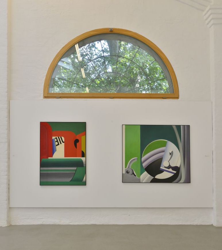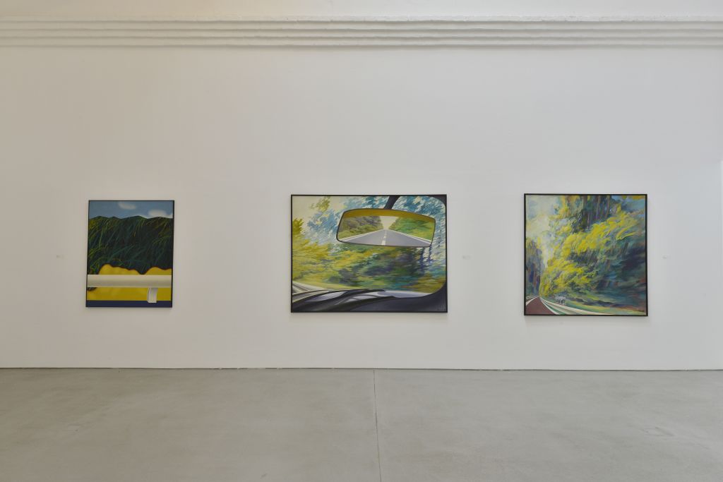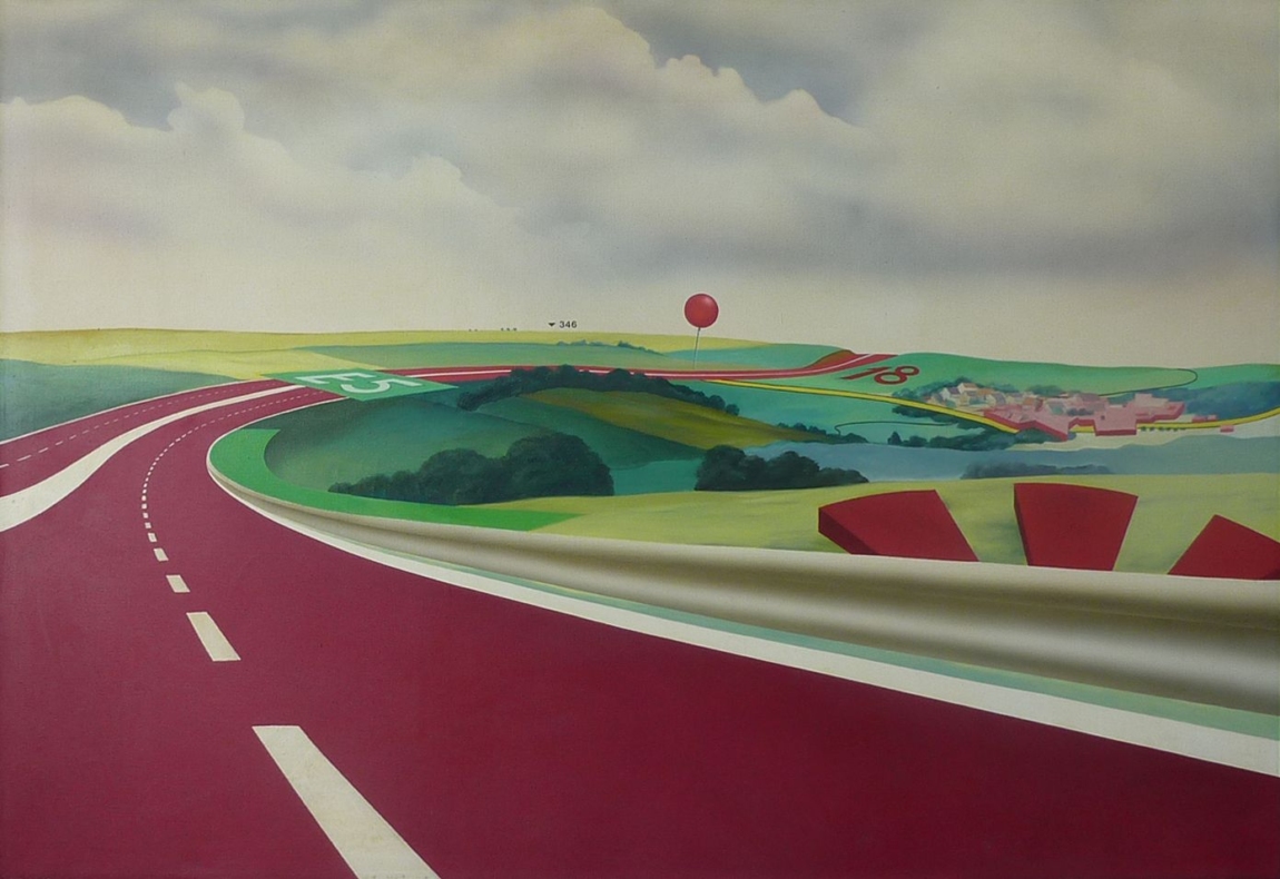Peter Berndt er-fährt die von Menschen veränderte Natur aus dem Auto und hält seine Seiten-, Rück- und Vorausblicke in Malerei und Zeichnungen fest. Fenster und Rückspiegel verbinden Vergangenes, Gegenwärtiges und Zukünftiges. Die Dynamik scheinbar bewegter Brandenburger Alleen vermitteln weiche, flüchtige Farbtöne – „Impressionismus mit 80 Sachen“ (Eberhard Roters). Seine aktuellen Bilder zeigen den Künstler als Erforscher von Strukturen in Ausschnitten der Natur wie Geäst und Blattwerk. Die Landschaften der 1960er und 70er Jahre verbindet Peter Berndt mit ironisch gesetzten, kartographischen Zeichen. Als Ausrufezeichen weisen sie auf Panoramablicke hin oder markieren den Rhythmus der gefahrenen Kilometer. Die Ausstellung im Kunstverein KunstHaus Potsdam vereint aktuelle Landschaftsbilder mit frühen Werken Peter Berndts aus seiner Zeit in Rom (1965–67). Mit kräftigen Komplementärfarben zeigt er hier die Gleichzeitigkeit einer Fülle an Wahrnehmungen von Gegenständen oder Figuren am Straßenrand in collageartig kombinierten Ausschnitten.
