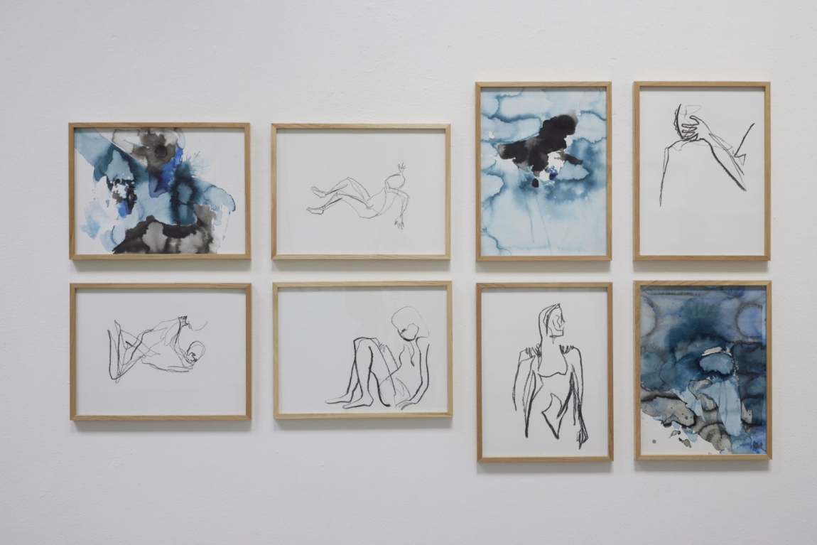 Ähnlich kleinformatig, kontrastierend und ergänzend zu der großformatigen Wandcollage, sehen wir weitere Zeichnungen von Petra Lottje. Hier geht sie einerseits spielerisch mit Aquarelltechnik um, lässt sich freudvoll auf beinahe unberechenbaren Farbverläufe ein, die an Unterwasserwelten erinnern, während sie sich in anderen Zeichnungen erneut auf situative zwischenmenschliche Situationen konzentriert.