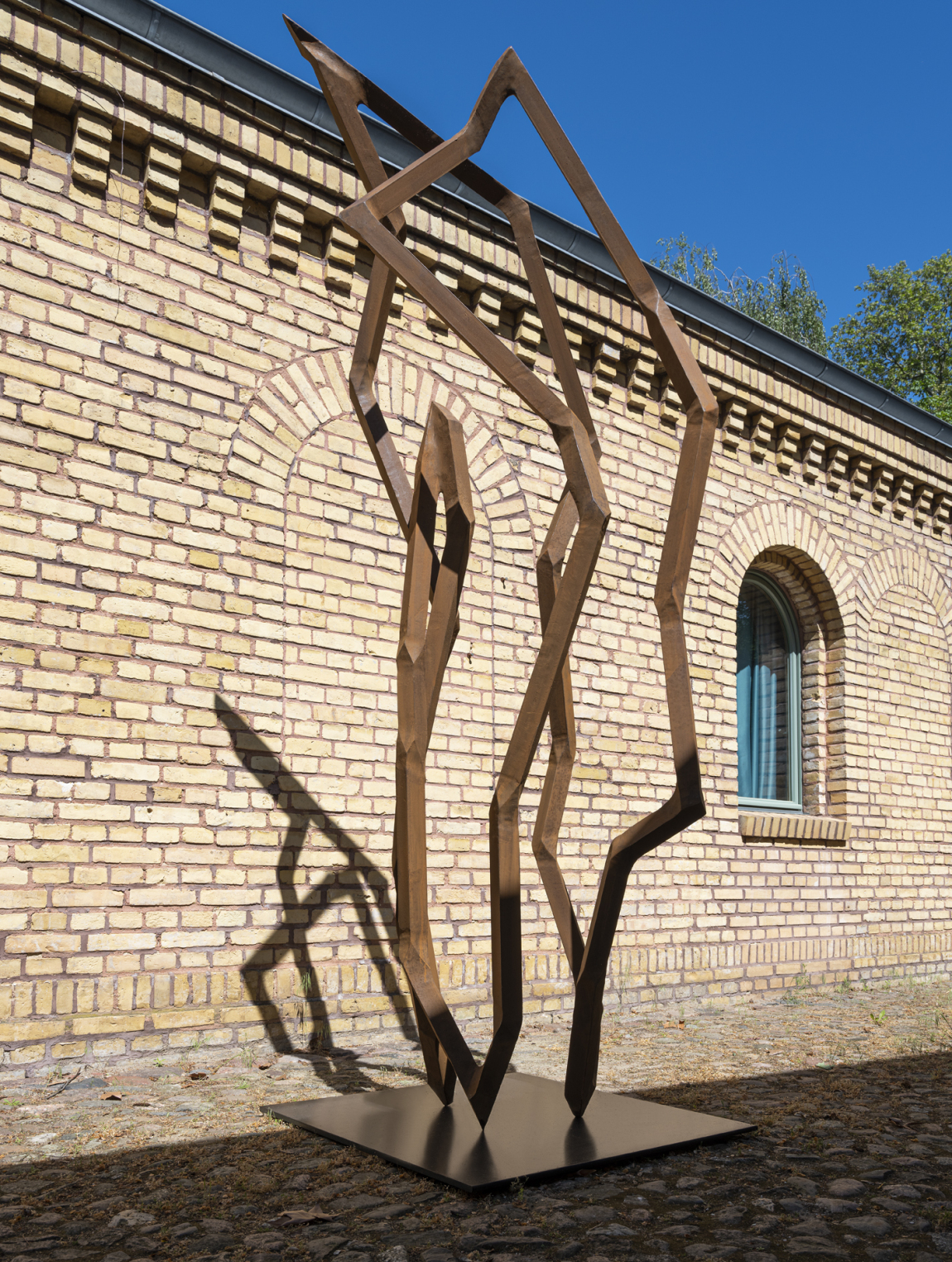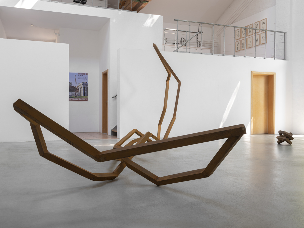 „Stahl ist bei mir die Achse, um die sich alles dreht.“ Robert Schads Skulpturen sind aus massivem Vierkantstahl gefertigt. Die von ihm getrennten Stahlstücke werden nicht gebogen oder geschmiedet, sondern stumpf verschweißt und verschliffen. So entsteht eine fast organische Form, eine Art Gelenk. Auch wenn der massive Vierkantstahl an physikalische Gesetzmäßigkeiten gebunden ist, so verschleiert doch die schwebende Linearität der Skulpturen die Schwere des Materials. „Wie der Tänzer den Raum einnimmt, ,betanzen‘ meine Skulpturen die jeweiligen Orte.“