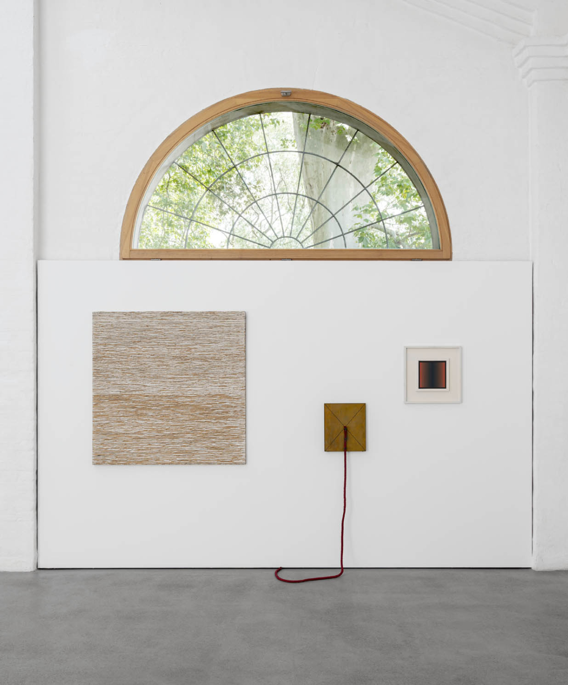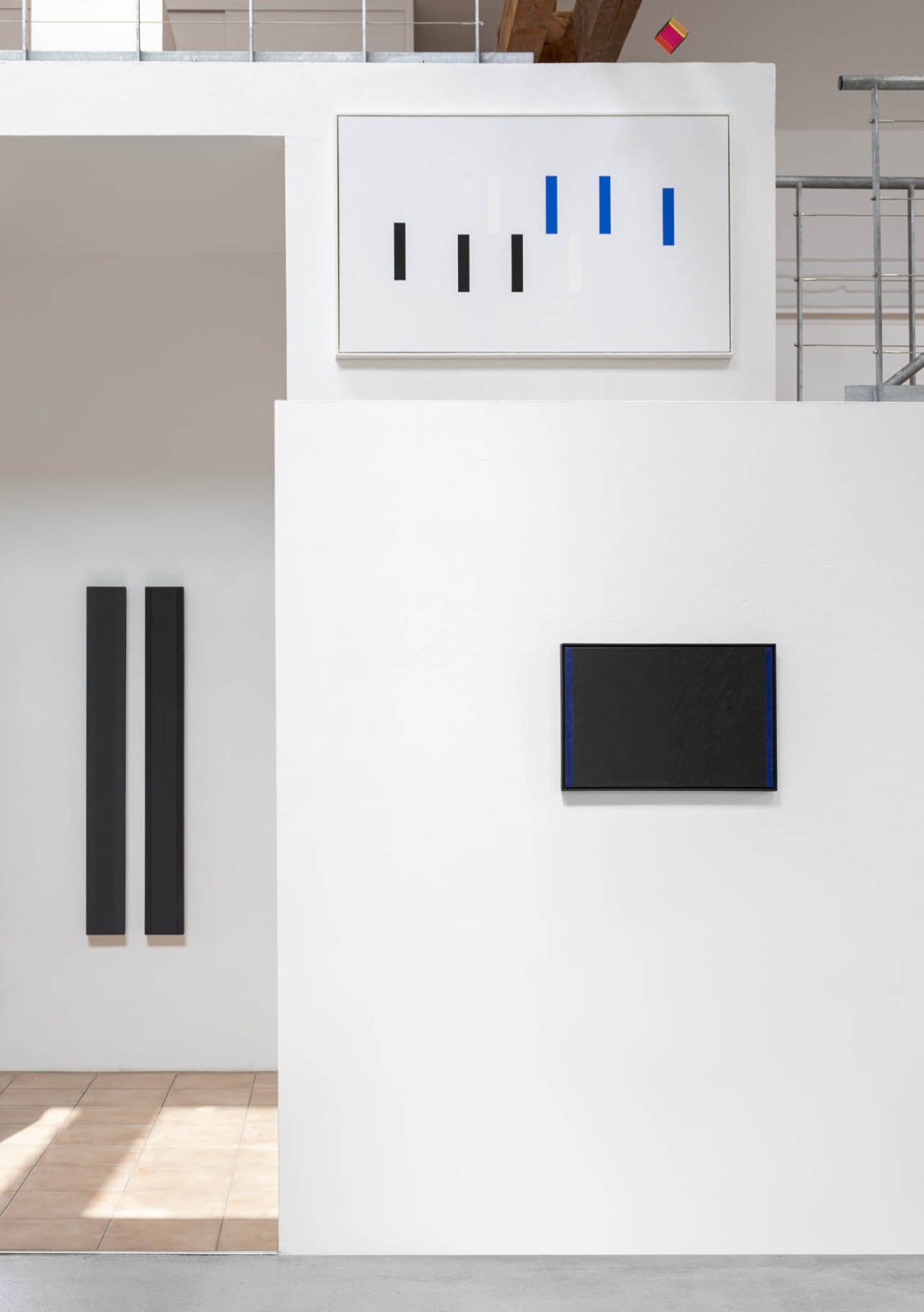Ein großer Dank geht zudem an die Berlinische Galerie, die mit der Leihgabe der Skulptur von George Rickey Peristyl IV von 1973 die Ausstellung eindrucksvoll und historisch komplettiert. Sechs einzelne, vertikal ausgerichtete filigrane Stabkonstruktionen aus Stahl entwickeln eine gemeinsame Bewegung und Dramaturgie, indem der Künstler jedem Einzelobjekt einen Stab mehr hinzufügte und deren Positionen variierte. Luftzug bewegt die einzelnen Stäbe, was deren Ausrichtung verändert, ohne dass sie sich jemals berühren.