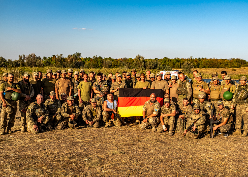 Dieses ist ein Gruppenfoto von ca 60 Soldaten, die sich in zwei Reihen aufgereiht haben. Die vordere Reihe kniet, die hintere steht. In der Mitte halten sie eine große ausgebreitete Deutschlandfahne. Einige von ihnen tragen Schutzwesten, einige haben einen Helm oder ein Maschinengewehr in der Hand. Die meisten von ihnen sind im T-Shirt. Sie blinzeln in die untergehende Sonne. Ihre Uniformen haben ähnliche Farben und Muster wie das vertrocknete, plattgetretene Gras vor ihnen und das Schilf und der Wald hinter ihnen. Das warme Sonnenlicht verstärkt den Eindruck, dass sie in ihrer Tarnkleidung mit der Umgebung verschmelzen. Wenn man sich damit auskennt, sieht man an ihren Abzeichen, dass es ukrainische Soldaten sind. Das Foto ist im September 2023 entstanden, am Ende eines sehr anstrengenden Trainings für die Freiwilligen im 505. Bataillon der 36. separaten Marines Brigade, Spezialkräfte. Ich finde, dass man den Männern die Anstrengung ansieht, aber wenn man sich die Gesichter anschaut, eins nach dem anderen, insgesamt auch eine gewisse Zufriedenheit. Das Bild hat eine friedliche Atmosphäre, eine Erinnerung an einen der letzten schönen Tage des Sommers.
